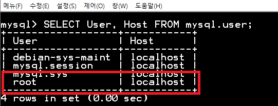 root의 호스트는 localhost로 설정 되어 있다. 이는 mysql이 설치되어있는 로컬 환경에서만 mysql접속을 허가한다는 것을 뜻한다.