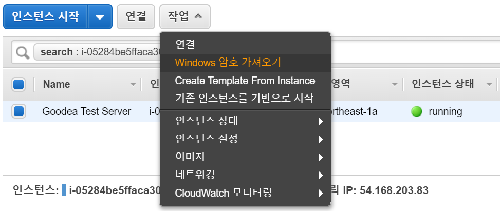 생성한 인스턴스를 선택 상단 작업 메뉴중 [Windows암호가져오기]를 눌러 로그인 정보를 가져온다.