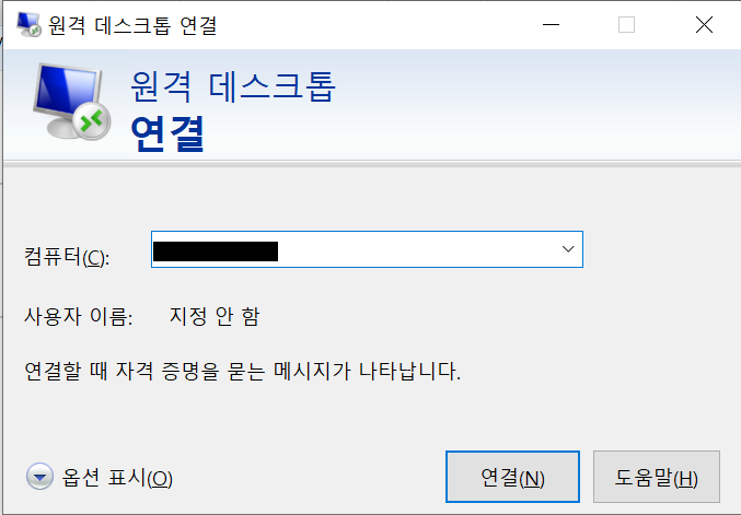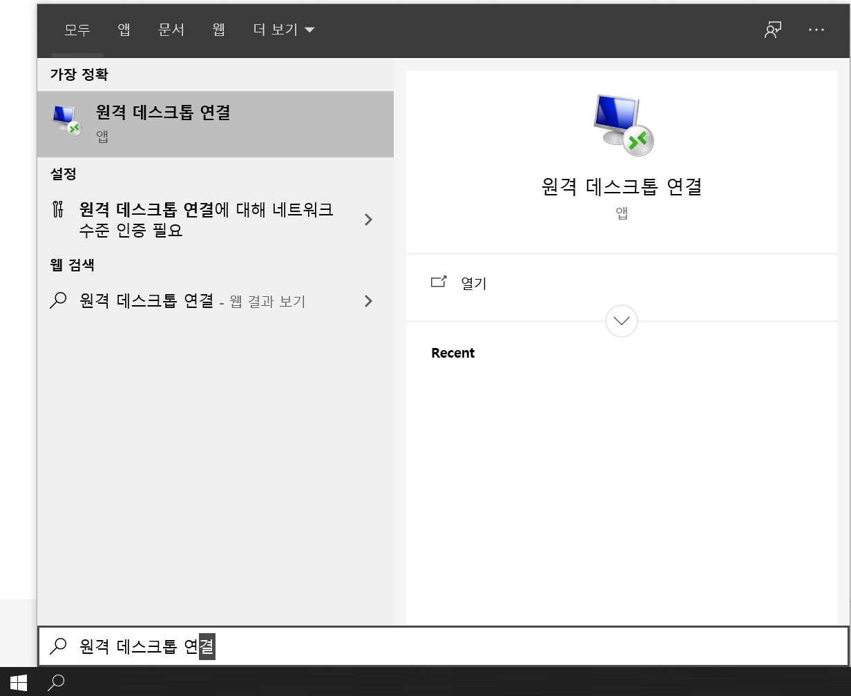 자신의 윈도우 시작바에서 원격 데스크톱 연결을 검색해서 실행해준다.
