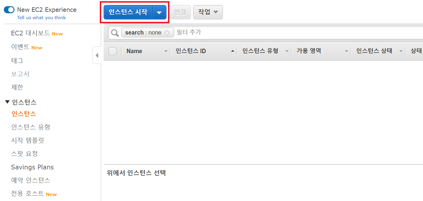 서비스 - 컴퓨팅 - EC2 - 인스턴스 메뉴에서 인스턴스 시작 버튼을 눌러 새 인스턴스를 작성해주자.