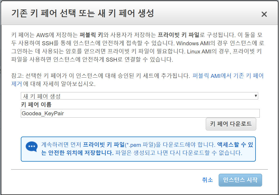 8️⃣ 기존 키 페어 선택 또는 새 키 페어 생성