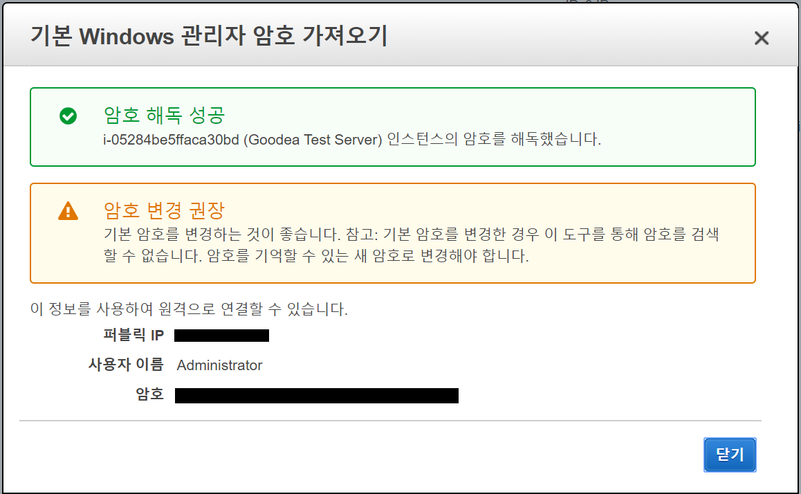 파일선택을 눌러 인스턴스 생성시 만든 키페어를 첨부하고 암호해독을 눌러준다.